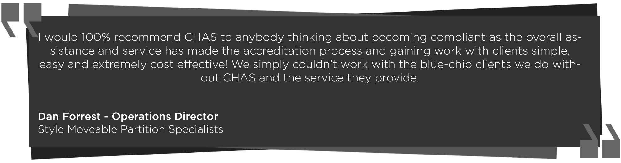 I would 100% recommend CHAS to anybody thinking about becoming compliant as the overall assistance and service has made the accreditation process and gaining work with clients simple, easy and extremely cost effective! We simply couldn’t work with the blue-chip clients we do without CHAS and the service they provide.